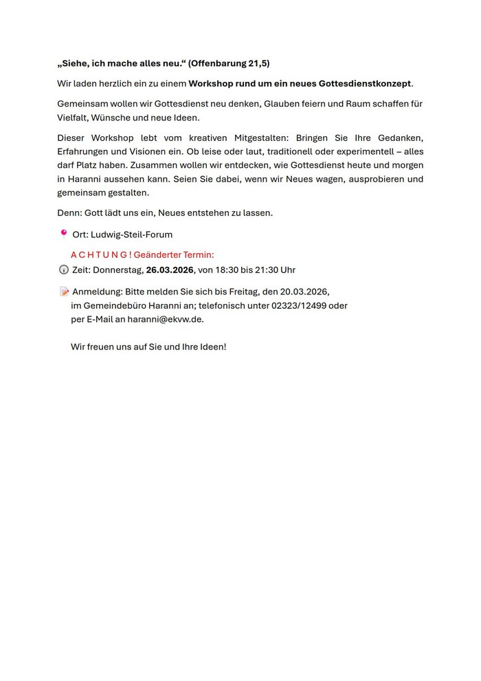 Gottesdienst-Workshop - 26. März, 18:30 Uhr - Ludwig Steil Forum